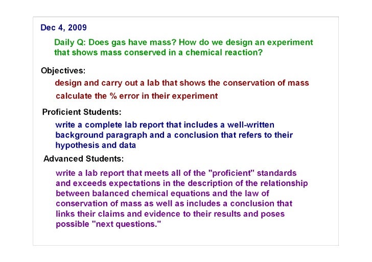 Tenth grade Lesson Conservation of Mass Lab | BetterLesson Elaborate (homework). Conservation of Mass Lab. Add to Favorites. A perfectly acceptable question would be, "Is mass conserved during the chemical reaction of iron and sulfuric acid. This question is simple and very testable.