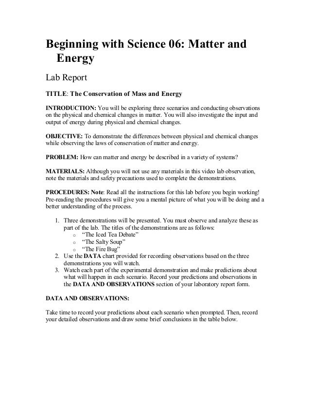 Conservation of mass lab. Law of conservation of mass- definition, formula, equation, examples Exceptions to the Law of conservation of mass. References and Sources. Who is Mikhail Vasilyevich Lomonosov? The law is in accordance with Dalton's atomic theory as he stated that the total number of atoms of chemical species involved in a chemical reaction remains conserved. Conservation of mass - BBC Bitesize In conservation of mass, the maths skills being used are addition and subtraction. The masses of the chemicals before the reaction can be added together. ... Working safely in the lab. 3 of 8. You ... › ~nas2173 › Lab2_ProjectileMotionNSExperiment 2: Projectile motion and conservation of energy INTRO TO EXPERIMENTAL PHYS-LAB 1494/2699 Experiment 2: Projectile motion and conservation of energy Nate Saffold nas2173@columbia.edu Office Hour: Mondays, 5:30PM-6:30PM @ Pupin 1216 PDF Conservation of Mass Lab The Law of Conservation of Mass states that mass in a closed system will remain constant, regardless of the processes acting on the system. Procedure: 1. Record the mass of an empty beaker using the digital scale or triple beam balance. 2. Add a set volume of water to the beaker...