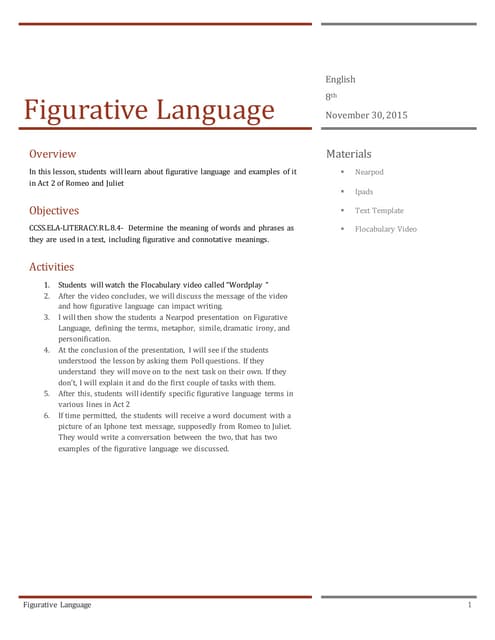 Lesson Plans On Figurative Language - 12/2021 Figurative Language Alive Lesson Plan Teacher: Blayne Garsky thSubject Area: ELA Grade Level: 9 Unit Title: Romeo and Juliet Lesson Title Free lessonplans.com. The students will: 1. interpret the figurative language of the first verse of "The Star-Spangled Banner" to create an illustration.
