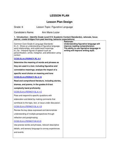 Lesson Plan: Figurative Language | Education World Lesson Plan: Figurative Language. Subject: ELA- Reading. Grade: 5. Lesson Objective: To understand what figurative language is and identify it in a text. Common Core Standard: CCSS.ELA-LITERACY.RL.5.4- Determine the meaning of words and phrases as they are used in a text, including...