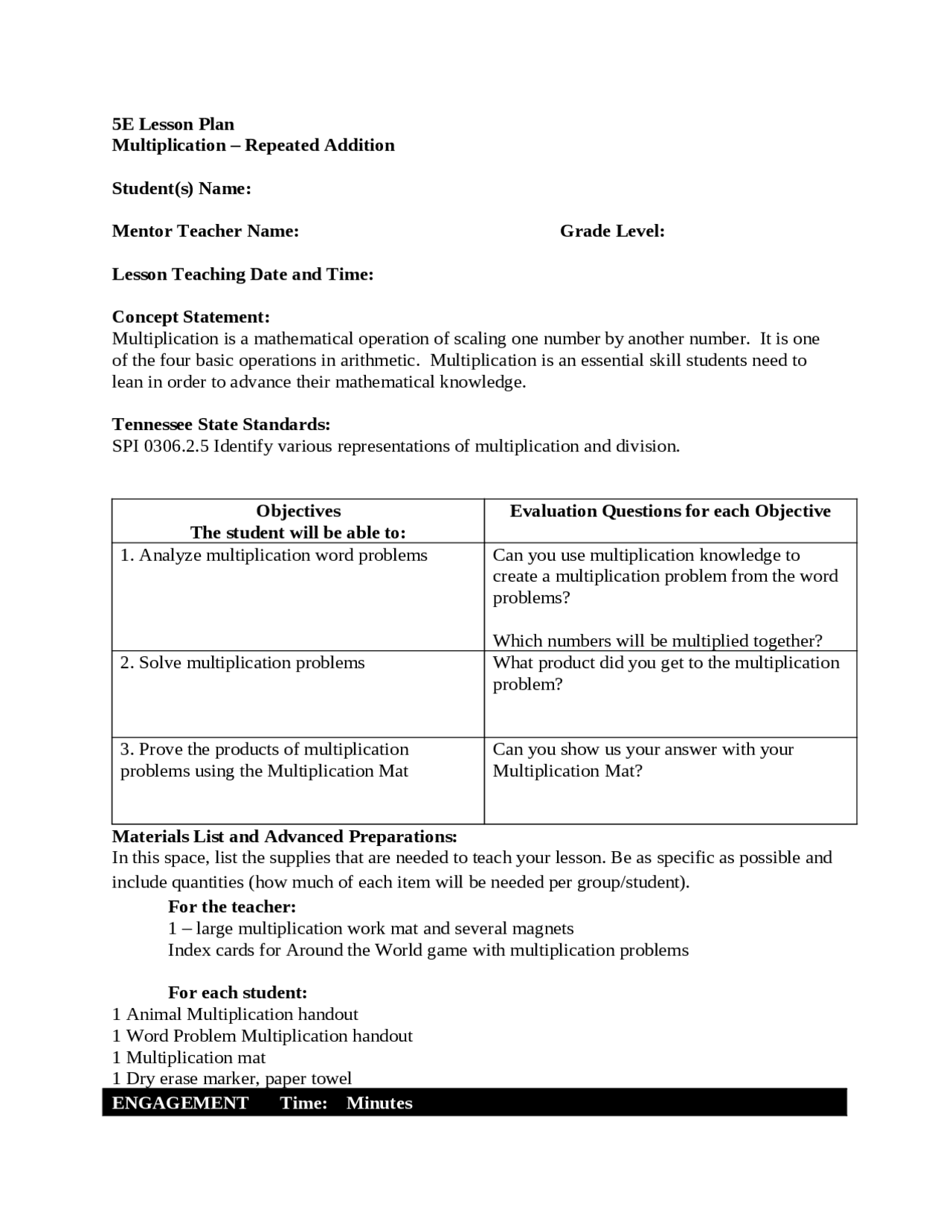 Empowering Students: The 5E Model Explained | Lesley ... The 5E Model is most effective when students are encountering new concepts for the very first time because there is opportunity for a complete learning cycle. According to co-creator Rodger W. Bybee, the 5E Model is best used in a unit of two to three weeks in which each phase is the basis for one or more distinct lessons. 1 Mathematics Lesson Planning based on 5E model Out of ... Mathematics Lesson Planning based on 5E model. Out of Many Models of teaching under Constructivist approach, 5E model is one of the most popular and ...6 pages 5e Lesson Plan Examples - Lesson Plans Learning The 5E Lesson Plan Is An Extremely Useful Way Of Planning Begin today if you want to compose lesson plans. There is no reason to wait until the next time that you can go back and also revise a lesson plan. You can simply start now. Gallery of 5e Lesson Plan Examples study.com › academy › courseElementary Math: Lesson Plans & Resources Course - Online ... Feb 06, 2022 · Lesson 34 - 5E Lesson Plan Template for Math 5E Lesson Plan Template for Math: Text Lesson Lesson 35 - Strategies to Reduce Math Anxiety in the Classroom ...