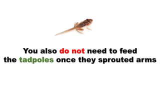 How often should you feed tadpoles? | Pet Keen What to feed tadpoles as pets? Once your tadpoles have begun to sprout legs, you can begin feeding them less for a while. They no longer need their tail and will begin absorbing it for nutrients, and you can begin normal feeding again once their tail has almost disappeared.