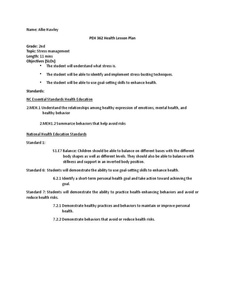 1st grade health lesson plans. Lesson Plans. Strand 1: HEALTH FOUNDATIONS AND PROTECTIVE FACTORS OF HEALTHY SELF (HF) Students will learn the importance of goals and decision-making skills and continue to develop healthy relationship skills. Standard 1.HF.3: Demonstrate how to express gratitude, treat others with kindness, and respect differences. We're Not That Different After All In this lesson plan, young elementary students will learn about proper hand washing and how germs are spread. The teacher uses talcum powder to represent the spreading of germs, how to cover your mouth, and how to wash hands. The teacher will also use the book, Miss Bindergarten Stays Home from Kindergarten as an example of how germs are spread. KidsHealth in the Classroom offers educators free health-related lesson plans for PreK through 12th grade. Each Teacher's Guide includes discussion questions, classroom activities and extensions, printable handouts, and quizzes and answer keys all aligned to National Health Education Standards. Search 1st Grade Lesson Plans. First grade is an exciting time for children as they move past the basics and begin to be introduced to reading & writing, science, and social studies. Education.com's stimulating first grade lesson plans outline instructions and provide teachers a wide assortment of materials that can be used to tackle every ...