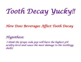 Try this Tooth Decay Science Project with Egg Shells at Home Our Tooth Decay Experiment with Eggshells - What We Did. The idea is to soak raw eggs in different liquids and observe the changes in their appearance and structure for 7 days. With the findings of this eggshells tooth decay science project, here's what parents can discuss with their children