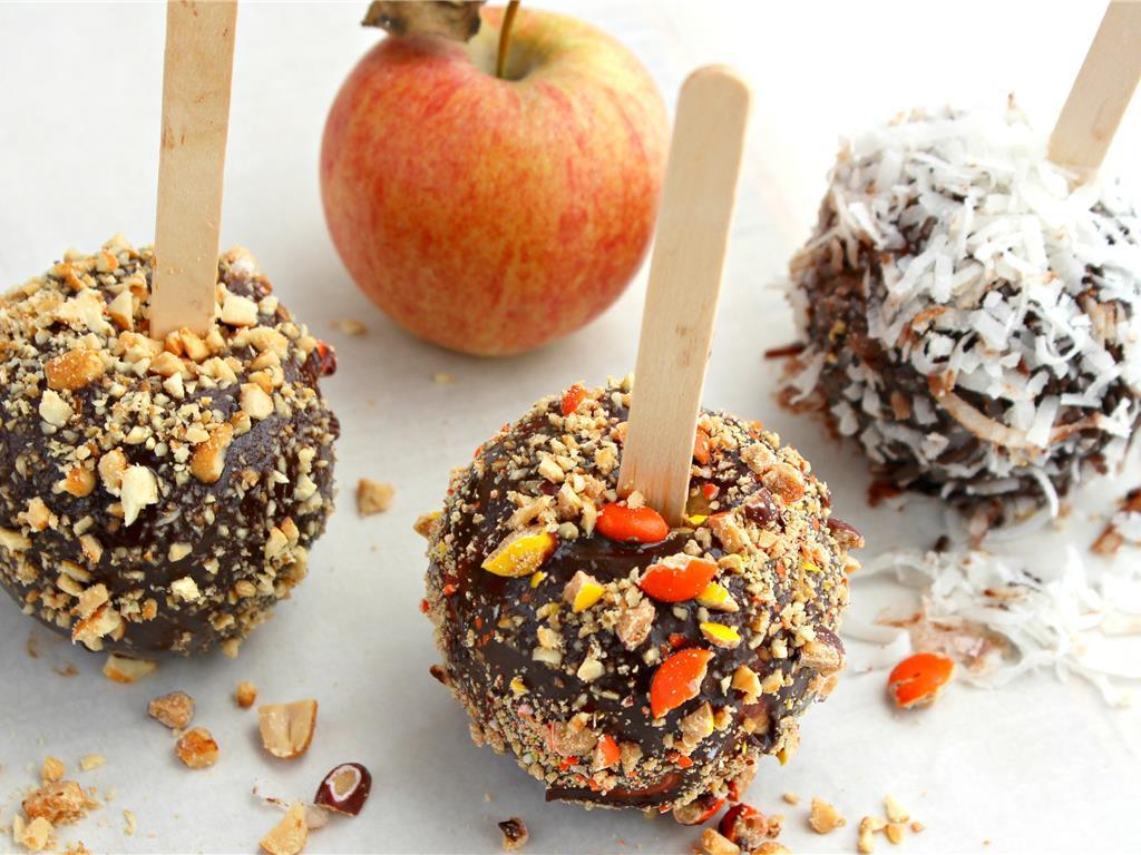 Paula Deen: Chocolate Dipped Apples Recipe - with Video Melt each kind of chocolate in separate bowls over double boilers. 1 at a time, gently dip the apples into the chocolate and roll around, making sure to thoroughly cover. Place on waxed paper. Using a spoon or wooden stick, carefully drizzle the white chocolate over the chocolate-covered apples.