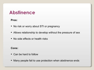 The Pros And Cons Of Comprehensive Sex Education | ipl.org The Pros And Cons Of Abstinence-Only Sex Education Programs 515 Words | 3 Pages. When you tell a teenager not to do something, they 're probably going to do it anyways. With 48% of today 's teens having sex, the step should be made to inform teens how to handle unwanted pregnancies with contraception. The Pros And Cons Of Abstinence Recovery - 1418 Words | Cram The Pros And Cons Of Abstinence Recovery. It is undeniable that the question "What are success rates of various abstinence recovery programs that drug/alcohol/smoking addicts go through?" is far from its conclusion. This is evident from the fact that there are numerous arguments raised by both opponents and proponents based on varied opinions. What are the Benefits of Sexual Abstinence and Outercourse? Both abstinence and outercourse are simple, free, and work really well to prevent pregnancy. In fact, abstinence is the only 100% effective way to avoid pregnancy. And outercourse really lowers your risk a lot. There are other benefits of abstinence. People choose abstinence to: wait until they feel ready for a sexual relationship