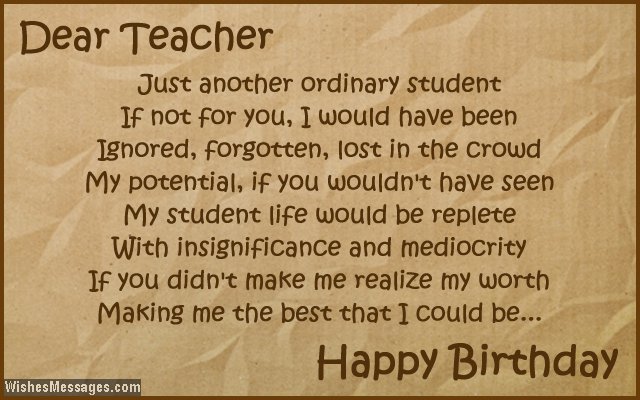 Birthday poems for teacher - Jolly Greets You are the best teacher and today is your birthday, please enjoy your day. Cake and balloons make the party go on, and I hope yours goes on so far. Happy birthday dear teacher. 5 You are a great teacher yes this is true. I've learned all I know from you. I hope you can see how much I learn from thee, And know that your teaching doesn't go in vain. 45+ Happy Birthday Wishes For Teacher - Quotes, Greeting ... Happy birthday, dear teacher! Never give up on your passion for teaching, and never stop inspiring your students. Your classes are more than a simple lesson on some subject, they are lessons on life. You manage to keep it both interesting and fun. I never thought I could have so much fun learning. Birthday Wishes for Teacher - Happy Birthday Wisher Happy birthday to the best teacher ever! I have nothing but gratitude for you and I want to thank you for everything you've done for me! My favourite teacher of all time Wishing a happy and blessed birthday to my favourite teacher of all time! I'm very fortunate to have found such a wonderful mentor in you! A teacher with a beautiful soul