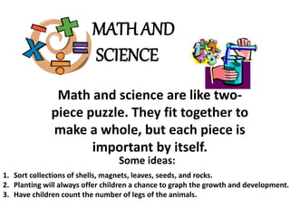 Math & Science for Young Children by Rosalind Charlesworth Math & Science for Young Children. Math and Science for Young Children, 5E is a unique text that focuses on the integration of math and science with the other important areas of child development during the crucial birth through eight age range. It also carefully addresses the ever-changing and important national standards: The National ... Learning math, science and technology helps preschoolers Unfortunately, young children don't get enough math and science experiences. Even well-regarded programs for young children tend to have a strong focus on language and social development but a weaker focus on math, and little or no focus on developing children's potential for scientific thinking.