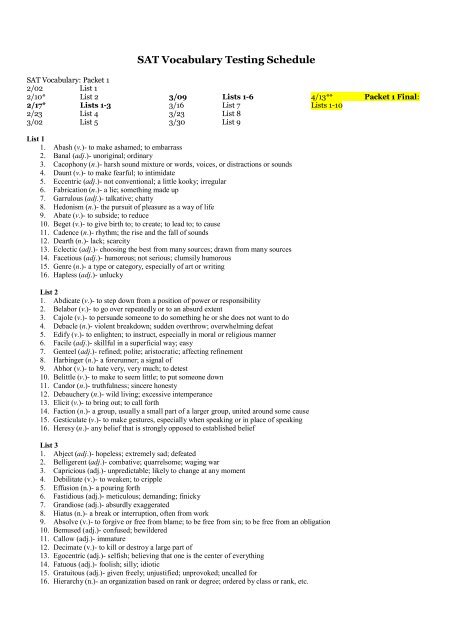 New SAT Vocabulary - Magoosh This list will get you started, but be sure to check out more vocabulary posts from Magoosh to stay on your toes! Dire // serious, urgent, or terrible Stark // total, severe (often used in the phrase "stark contrast") Candid // straightforward, natural, sincere Austere // strict, simple, harsh, or frugal Anomalous // unusual, abnormal 250+ SAT Vocabulary Words Every High School Student Should ... 250+ SAT Vocabulary Words Every High School Student Should Know. The SAT is one of the most popular college-preparatory tests administered by the College Board. Millions of high school students decide between the equally popular ACT or the SAT (some even take both) to improve their chances of gaining admittance into their dream colleges. While both tests are designed to determine how ready a ... Sat Vocabulary List-Sat Resources - 1 File Download Act English Cheat List-Sat Resources. 100 Sat Vocabulary Questions. Word List 4 Sat 2018. Word List 3 Sat 2018. Vocabulary Cartoon Sat. Seberson Method New Sat Vocabulary Workbook Over 700 Highfre. Sat Math Vocabulary 2018. Sat Act Reading List. New Sat Vocabulary List.