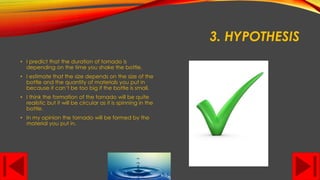 Make a tornado in a bottle - SlideShare HYPOTHESIS • I predict that the duration of tornado is depending on the time you shake the bottle. • I estimate that the size depends on the size of the bottle and the quantity of materials you put in because it can't be too big if the bottle is small.