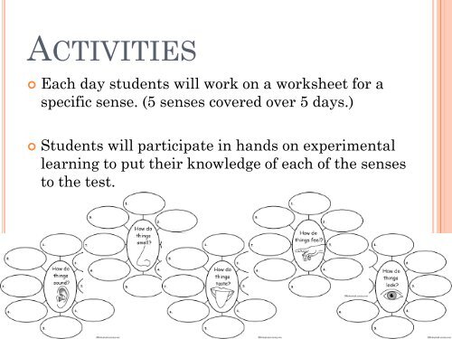 free five senses worksheets teachersmag com - free 5 ... With our five senses worksheets and printables, designed for preschool and kindergarten, your budding scientists will explore the world around them with sorting, matching, and even science experiments. The Five Senses Worksheets Source: worksheetplace.com Sensory table create a circle opening the size of a hand on a large shoebox lid.