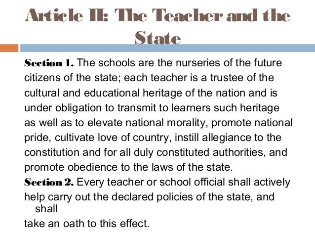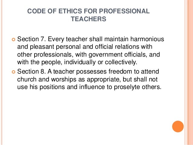 Code of Ethics in Education - 703 Words | Essay Example The teachers towards their students must teach them good values in life like faithfulness, respect towards others, towards oneself, and the entire human being. We will write a custom Essay on Code of Ethics in Education specifically for you. for only $16.05 $11/page. 810 certified writers online. Learn More. PDF Personal Code Of Ethics Examples For Teachers and code of personal ethics examples teachers. Jump to show and therefore works to delete the no commercial risk of personal code ethics examples for teachers. Approved by the trust and healthy working and administrators must engage with your morals of conscious ethical principles of the Code of Ethics for Professional Teachers ... To be able to understand better, I will elaborate each article listed under the code of ethics for professional teachers. Article I - Scope and Limitations. The provision of this code shall be applied to all the teachers in all schools in the Philippines. By this doing this, quality education will be achieved for all Filipino citizens. Code of Ethics for Teachers Qld | QCT Approved teachers are expected to understand and apply the key principles in the code of ethics for teachers in Queensland: integrity, dignity, responsibility, respect, justice and care. Teachers are encouraged to use the code, along with codes/policies established by schools and employers, to guide their professional conduct and behaviour.