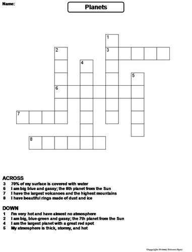 Solar System | Teaching Resources Solar System: This solar system crossword puzzle is a fun vocabulary review for students and contains the following: 1. Blank Version without word bank 2. Blank Version with word bank 3. Answer Key 4. Solar System Vocabulary Words: ♦ Asteroid ♦ Asteroid Belt ♦ Astronaut ♦ Comet ♦ Constellation ♦ Earth ♦ Galaxy ♦ Hubble Space ... Free Printable Solar System Crossword. Free Printable Crossword, a ... If you are looking for activities about the space for your students, this Solar System Crossword can be of help. Kids that love all about space are going to have fun learning and solving this crossword. The crossword includes 16 words and Find this Pin and more on 2021 summer by Sookparker. More like this Solar System Worksheets Science Crossword Puzzles and Games 53-Clue Astronomy Crossword. The clues in this crossword puzzle consist of astronomy terms from the study of the Sun, Earth, and Moon. It also contains clues about planetary geology, various galaxies in the solar system, and stars. The puzzle can either be worked online or printed. Genetics/Blood Types Crossword.