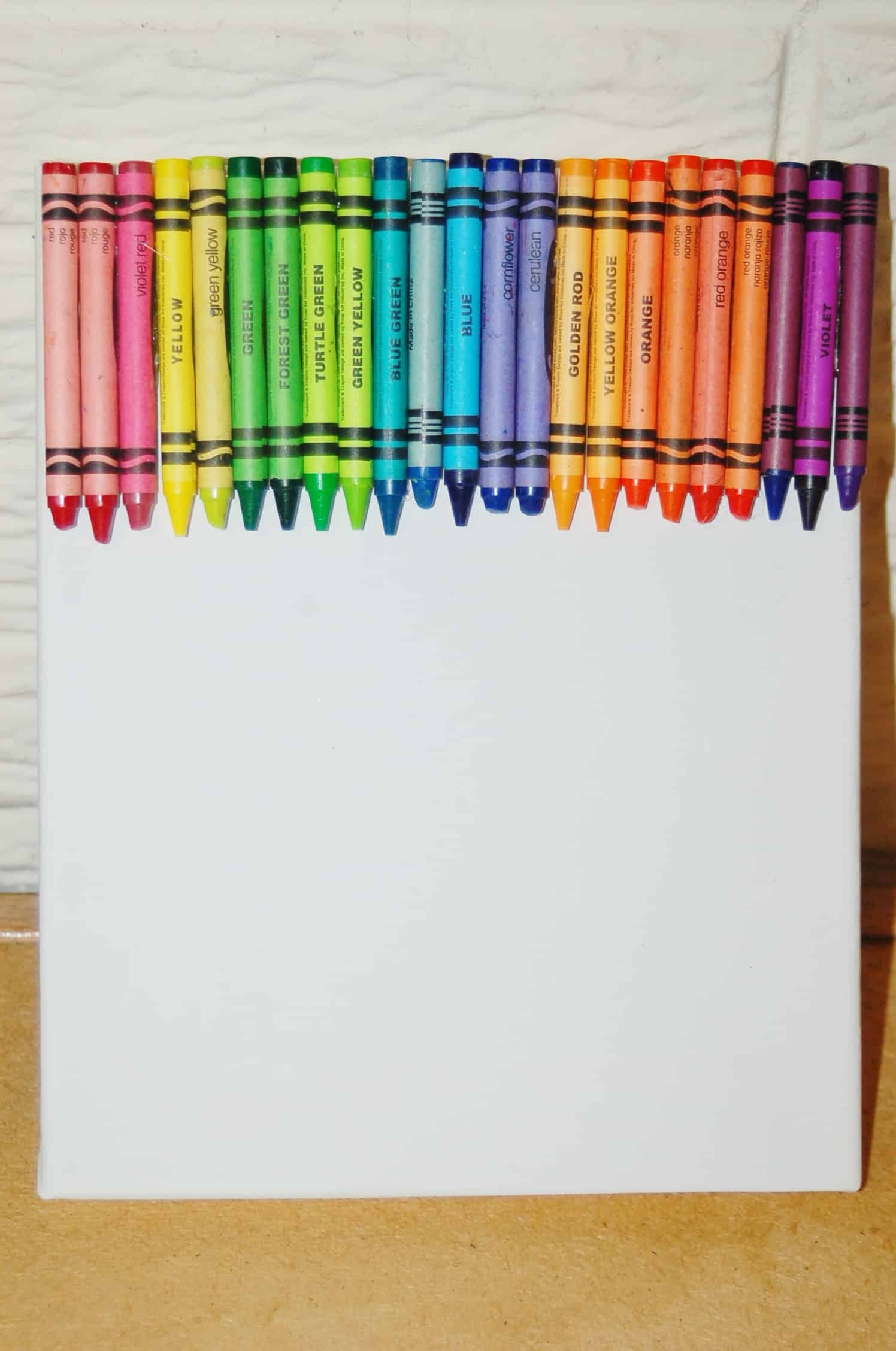DIY Melted Crayon Canvas, Crayon Craft | Crafts - crayola.com Steps: Hide Images 1 Line up crayons of your choice to span the length of the canvas. 2 Ask an adult to attach crayons to canvas with hot glue gun. 3 Create the first letter of your name on the canvas using painter's tape. 4 In a well-ventilated area, prop canvas up on protected surface. Secure canvas so that it remains in a standing position. 5