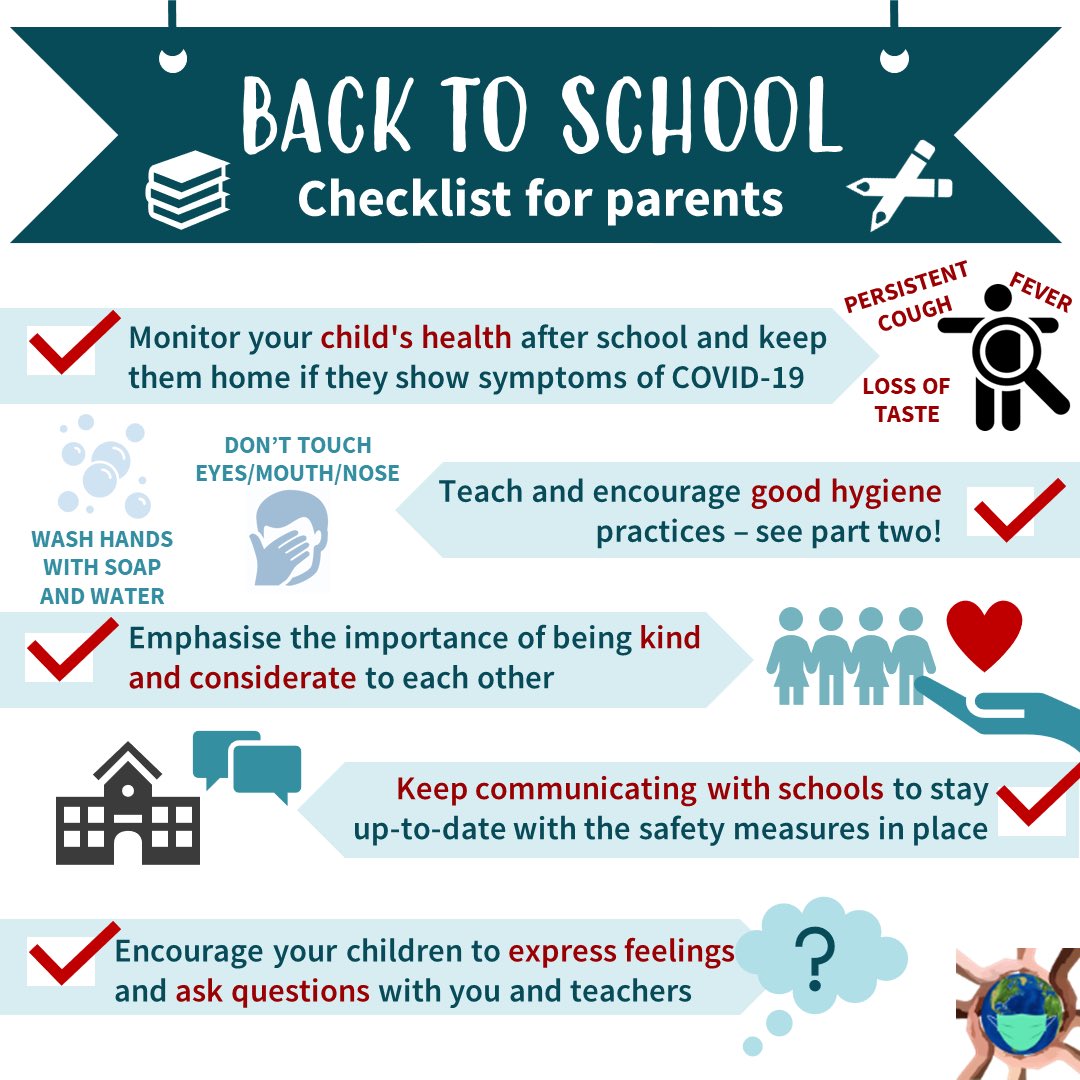 Resource: Back to School Checklist for Parents | Youth.gov Parents and guardians can use this checklist to ask school leaders about how they are supporting students, including by using American Rescue Plan (ARP) funds. The checklist is broken into four categories: Student learning Addressing the needs of the whole child COVID-19 health and safety Engaging families Learn more.