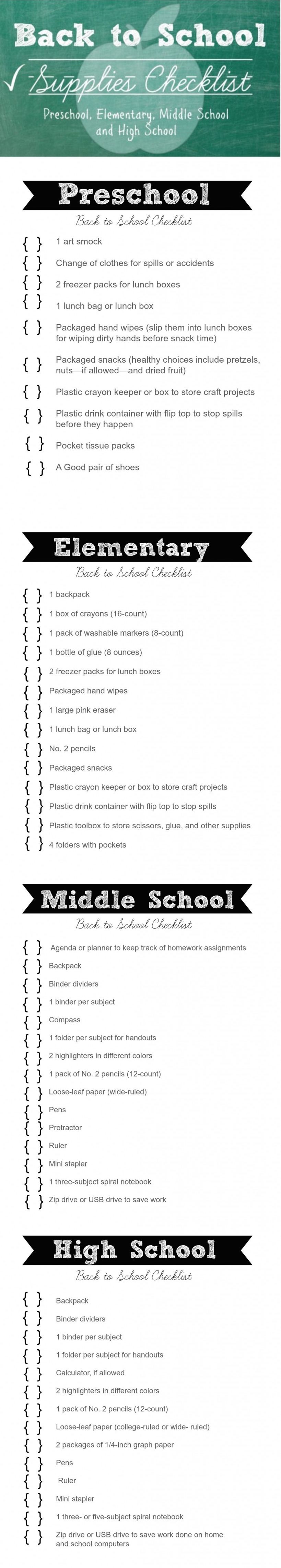 › back-school-suppliesBack-to-School Supplies Checklist for Every Age Group ... Aug 04, 2017 · While there may be some impulse purchases along the way, a back-to-school shopping checklist will help keep you and your child on track. To help, we’ve put together a back-to-school supplies checklist for high school, middle school, and elementary school students. Skip to your age group: Back-To-School Supplies List For Elementary School