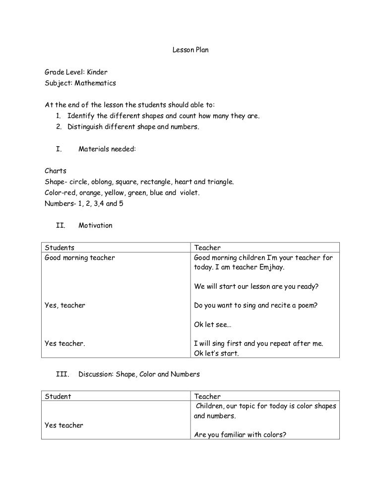 11+ Preschool Lesson Plan Examples & Templates Preschool is the first out of home organized experience for children. For many this is the first time they are away from home. Children are nervous and excited. It is important to capture the attention of these young minds and make learning attractive to them. The goal of a good preschool lesson plan should be to keep it simple yet fun while covering all the essential … › princesspinero1 › lesson-planLesson Plan for Shapes - SlideShare Lesson Plan for Shapes 1. The four basic shapes 2. a. identify and describe the 4 basic shapes; b. relate the shapes to the object around you; and c. to give at least 3 examples of different objects correspond by each shapes. 3. Circles, as you notice, they doesn't have edges and they are round 4.
