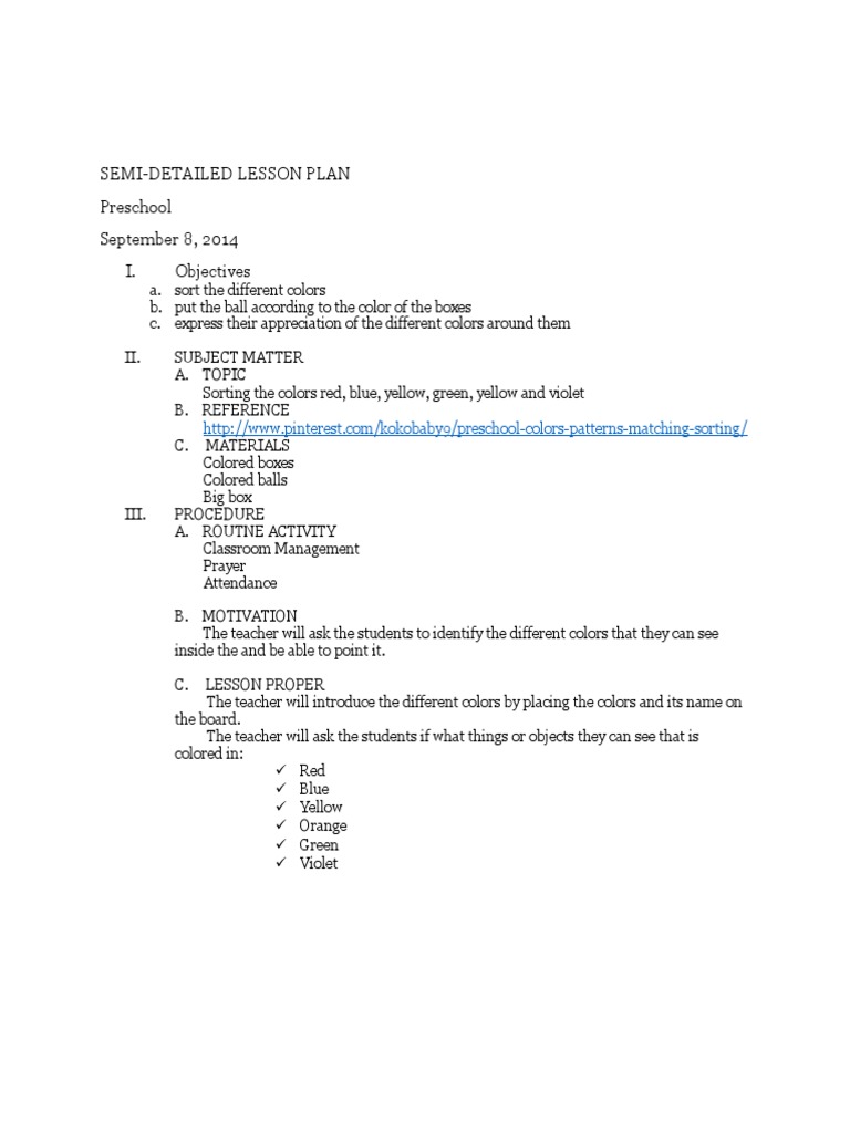 Lesson plan about colors for preschool. A Year of Preschool Lesson Plans: 20 Themed Units! 19/01/2018 · Each preschool lesson plan unit is packed with literature-based activities that are easy to prepare and fun to implement. What you’ll get in each individual preschool lesson plans unit: – 24 hands-on ideas that will help your child succeed in preschool – A variety of themed hands-on activities based on literature – Ideas to build vocabulary and early literacy skills with … Joseph and His Brothers – Families (Preschool Bible Lesson) 23/01/2010 · Bible Story: Joseph and His Coat of Many Colors Scripture: Genesis 37:3-4, 17-28 Target Age Group: Age 2 – 5 (U.S. preschool ages) Time: 20 Minutes Learning Context: Church Preschool Class Printer Friendly Bible Lesson: [print_link] this lesson plan You Can Help: Please leave your feedback and suggestions for this lesson plan. Others will benefit from your … Preschool Colors Theme Activities - Pre-K Pages Colors Theme Activities for Preschool, Pre-K, and Kindergarten. Books about Colors. Color Theme Activities. 5 Day Color Lesson Plan. Day 1: Read Frog Street Press color book to class. Introduce the color box and shape. Sing Frog Street Press color song. Show the book and turn the pages as you sing the song. Place a copy of the color song and book in your listening … Preschool Lesson Plan Template Teaching Resources | TpT Preschool Lesson Plan Template for Google Drive in OCEAN BRIGHT COLORS. by . Bee Your Best. 4.9 (28) $3.00. PDF; Google Apps™ These Preschool Paperless Lesson Plan Forms are created in Google Slides using a widescreen format. This product consists of 7 slides for you to duplicate and to organize your preschool plans. Text boxes have been inserted to simplify …