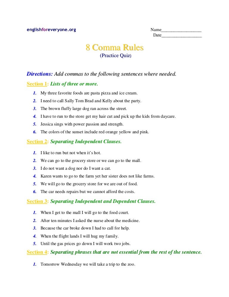 7 Printable Comma Usage Worksheets for the Classroom Oct 23, 2019 ... Download 7 free comma usage worksheets to help students in grades 3–12! Comma rules practice, commas in a series worksheet, comma placement ...