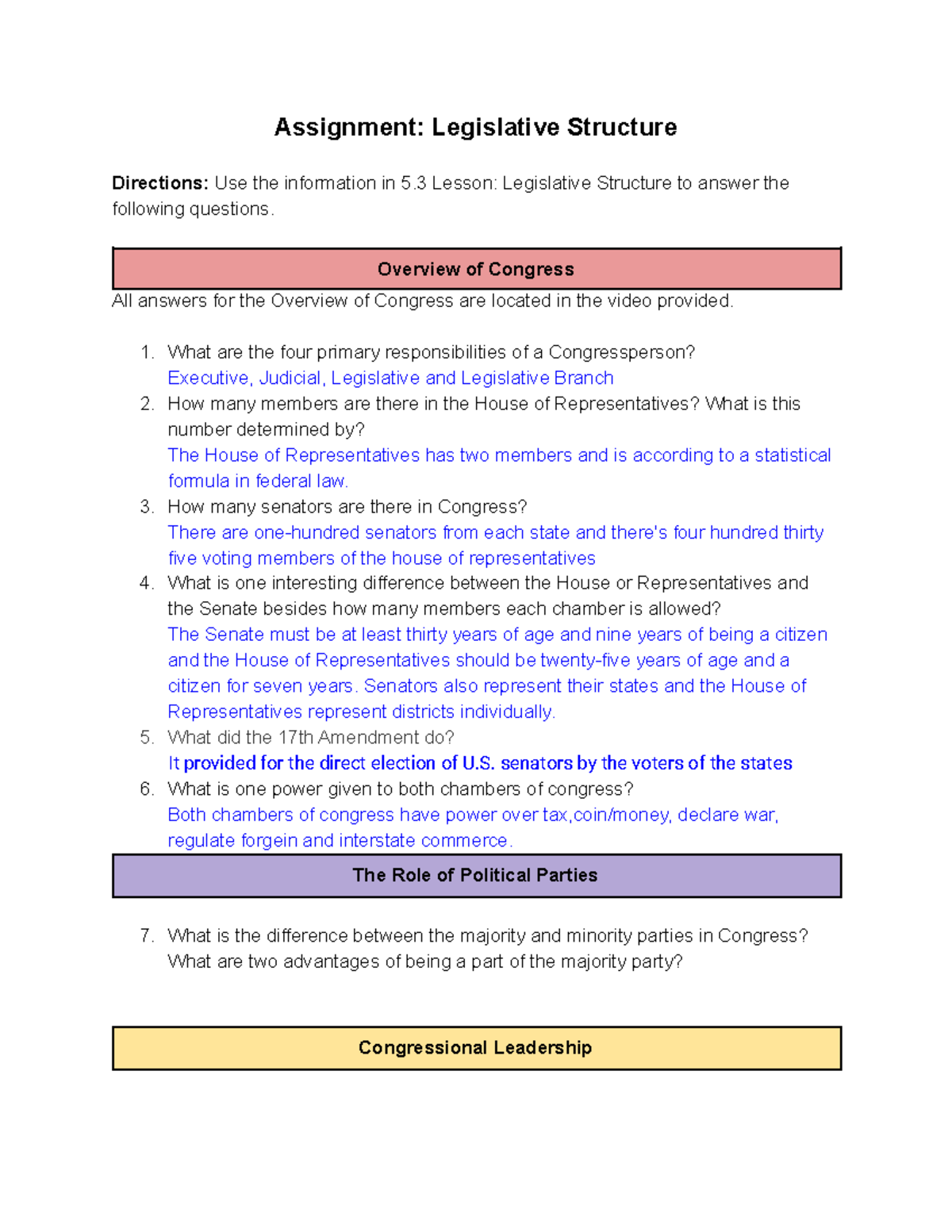 PDF Legislative Branch Lesson Answer Key - USCIS More About the U.S. Congress Page 4—top The Speaker of the House is in charge of the U.S. House of Representatives. What is the name of the Speaker of the House of Representatives now? Paul D. Ryan If the President and the Vice President can no longer serve, the Speaker of the House becomes President. Review—The U.S. Congress Page 4—middle PDF WORKSHEET 1 - Archives WORKSHEET 3 Congress is the Elected, Representative Branch of Government Article I of the United States Constitution establishes the House of Representatives and the Senate as distinct representative bodies with balanced responsibilities and the power to act together to create legislation. PDF The Structure of Congress - Weebly The structure and organization of the House of Representatives greatly affects the progress of a bill through the House. The complex rules under which the House operates help ensure swift action on legislation once it reaches the House floor. However, most of the work on bills is performed by the various committees of the House. Quiz & Worksheet - Role & Duties of Congress | Study.com This quiz and corresponding worksheet gauge your understanding of the roles and duties of Congress. Topics you'll need to know to pass the quiz include the concept of a bicameral legislature and ...