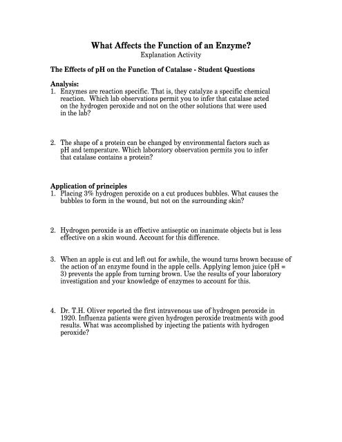 PDF Enzymes: What's in your spit? - Stanford University Created by LABScI at Stanford 5 Part 2 - How does pH affect enzyme activity? (Starch and Amylase) Starch is a carbohydrate found in many foods, such as wheat, corn, rice, and potatoes. It is a long chain of sugars linked together. The enzyme amylase breaks the bonds linking the glucose molecules in starch. Your saliva contains amylase to break down the starchy foods that you eat. Enzyme Action Testing Catalase Activity Lab Answers .pdf - las.gnome enzyme-action-testing-catalase-activity-lab-answers 1/2 Downloaded from las.gnome.org on November 23, 2022 by guest Enzyme Action Testing Catalase Activity Lab Answers When people should go to the book stores, search establishment by shop, shelf by shelf, it is truly problematic. This is why we present the book compilations in this website. AP Sample 4 Lab 2 - Enzyme Catalysis - BIOLOGY JUNCTION a) What is the enzyme in this reaction? Catalase is the enzyme in the reaction. b) What is the substrate in this reaction? The substrate is hydrogen peroxide. c) What is the product in this reaction? The products are oxygen (gas) and water. d) How could you show that the gas evolved is oxygen? gizmos.explorelearning.com › find-gizmos › launch-gizmoEl Gizmos - ExploreLearning Find Your Solution. Start playing, exploring and learning today with a free account. Or contact us for a quote or demo. Sign Up For Free Get a Quote