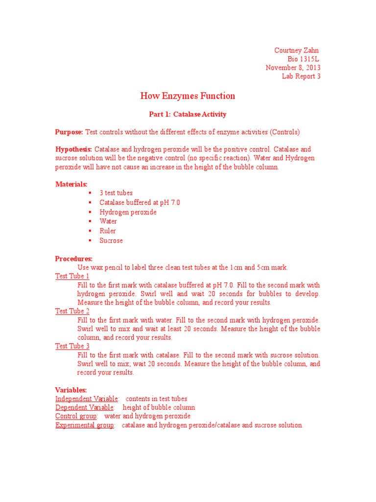 Activity 3: Restriction Enzyme Analysis Education Center - K-12 Lessons and Laboratories - Classroom Activities in Plant Biotechnology: Activity 3 - Restriction Enzyme Analysis...Introduction Special enzymes termed restriction enzymes have been discovered in many different bacteria and other single-celled organisms. These restriction enzymes are able to scan along a length of DNA looking for a particular … Investigating an enzyme-controlled reaction: catalase and … Class practical or demonstration. Hydrogen peroxide (H 2 O 2) is a by-product of respiration and is made in all living cells. Hydrogen peroxide is harmful and must be removed as soon as it is produced in the cell. Cells make the enzyme catalase to remove hydrogen peroxide.. This investigation looks at the rate of oxygen production by the catalase in pureed potato as the … Lab Report: Enzymes | PDF | Catalase | Ph - Scribd Catalase is an enzyme, which is produced by every cell. Its purpose is to break down hydrogen peroxide (H2O2). Hydrogen peroxide is a waste product of cellular activity. It is poisonous to cells. Catalase speeds up the decomposition of hydrogen peroxide into harmless water and oxygen gas (2 H2O2-catalase2 H20 + O2)