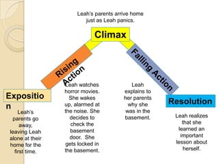 9 Key Elements of a Short Story: What They Are and How to Apply Them When it comes down to the elements of a short story, focus on nine key elements that determine if the short story is a complete story or a half-baked one. " A short story contains nine key elements that make it a complete story. Learn about each in this article. Tweet this 1. Character Characters in books are well-drawn. Parts of a Story Activities | Teaching Plot Structure Most Common Parts of Plot Introduction The beginning of a work of literature; the setting and characters are introduced. Problem The "conflict" or "problem" is the primary obstacle that the main character must overcome. Events The sequence of events or attempts to overcome the problem. Climax The turning point of the story. Resolution PPT 5 Elements of a Short Story - Tuscaloosa County School District The 5 key elements that make up a short story are: Characters Setting Conflict Theme Plot * Character A character is a person, or sometimes an animal, who takes part in the action of a short story or other literary work. PPT - PARTS OF A SHORT STORY PowerPoint Presentation, free download ... PARTS OF A SHORT STORY Student Notes Plot Diagram 3 4 2 1 5 PLOT DIAGRAM Plot (definition) • Plot is the organized pattern or sequence of events that make up a story. Every plot is made up of a series of incidents that are related to one another. 1. Exposition • This usually occurs at the beginning of a short story.