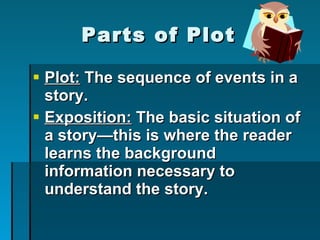 Main parts of a plot in a story - Juicy English There is a specific plot structure that most stories follow. In fact, there are six main plot parts: exposition, conflict, rising action, climax, falling action and resolution. 1. Exposition or Introduction. The exposition is the introduction to the story. The characters and setting are introduced. The background information provided by ...