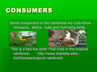Rainforest Food Web - Science Struck Primary Consumers: These are various herbivores (as well as some omnivores and insectivores) that feed on the producers (plants). The tropical rainforest animals in this group include capybaras, tapirs, deer, monkeys, squirrels, grasshoppers, etc. In temperate rainforests, primary consumers include monkeys, snakes, elks, and other small mammals ... Consumers - The Amazon Rainforest Ecosystem Consumers Symbiotic Relationships Food Web Producers decomposers marsh grass, plankton, and trees. bridal veil stinkhorn fungus and mushrooms primary consumers secondary consumers fish, ants, and insects. deer, kinkajous, river otters, and tapirs. Consumers - Laotian Rainforest - Google Consumers. Douc langurs are found in the Southeast Asian countries of Cambodia, Laos and Vietnam. Its habitat is in the lowland to montane primary and secondary rainforest where it lives in the mid to upper levels of the canopy. Red-shanked douc langurs are diurnal and eat, sleep and feed in the trees of the forest.