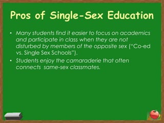 Single-sex education - Wikipedia Single-sex education, also known as single-gender education and gender-isolated education, is the practice of conducting education with male and female students attending separate classes, perhaps in separate buildings or schools. The practice of single-sex schooling was common before the 20th century, particularly in secondary and higher education. 20 Abstinence Only Sex Education Statistics - HRF The problem is that many of the statistics say that abstinence only sex education isn’t helping matters at all. Although supporters will point toward the fact that teen pregnancy rates are at some of the lowest rates of all time, those who support contraceptive use and safe sex practices can point to effective uses of birth control, condoms, and other items that help to prevent the spread of ... Single-Sex Education: Pros and Cons T Single-Sex Education: Pros and Cons he U.S. Department of Education defines single-sex education as “education at the elementary, secondary, or postsecondary level in which males or females attend school exclusively with members of their own sex” (U.S. Department of Education, 2005).