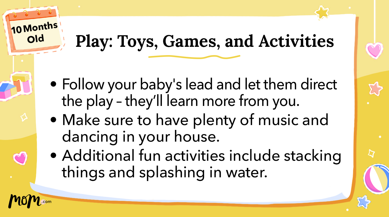 10-Month-Old Baby Activities: 8 Things to Do With Your Child You may also involve them in certain 10-month-old baby games. Activities like stacking, sorting, and arranging work well to fuel the concentration and motor skills of your little one! References History of updates