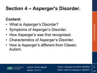 Asperger's in adults: Signs and symptoms - Medical News Today Asperger's in adults typically causes issues with communication, emotion regulation and interpretation, social interactions, and behavior. People who have Asperger's may also experience other... ADHD and Adult Autism: Symptoms, Signs, Diagnosis, Interventions - ADDitude ADHD is characterized by symptoms of inattention, hyperactivity, and/or impulsivity - different from the social communication symptoms and restricted behaviors associated with autism. Still, some ADHD symptoms relate to the diagnostic criteria for autism. NIMH » Autism Spectrum Disorder Overview. Autism spectrum disorder (ASD) is a neurological and developmental disorder that affects how people interact with others, communicate, learn, and behave. Although autism can be diagnosed at any age, it is described as a "developmental disorder" because symptoms generally appear in the first 2 years of life.