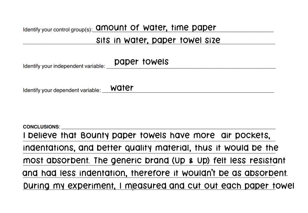11 Best Bath Towels 2023 - Soft and Absorbent Bath Towel Reviews Riley's towel uses a zero-twist combed cotton construction, meaning the fibers are longer and stronger so it's softer, more absorbent and more durable. At-home users unanimously gave it perfect... Sample Science Fair Project: Paper Towel Experiment Water absorbs into the paper towel by water being pulled into little open spaces between the fiber, soaking the absorbing the water and soaking the paper. Paper towels are one of many things that are absorbent. Paper towels are one of the most used absorbent items used in households in the U.S. Bibliography Folded or Flat Paper Towel: Which One Absorbs More Water? Paper towels are especially absorbent because their cellulose fibers have empty spaces—tiny air bubbles—between them. Water molecules, which like to stay together, follow the one another as... What Brand Of Paper Towel Is Most Absorbent Science Project The results of the experiment were that the Sparkle brand paper towels were the most absorbent. It absorbed on average, 50ml of water, when the Bounty brand paper towels absorbed only 44. 75ml of water. Bounty Likewise, are more expensive paper towels more absorbent? "More expensive brands of paper towel are more absorbent.