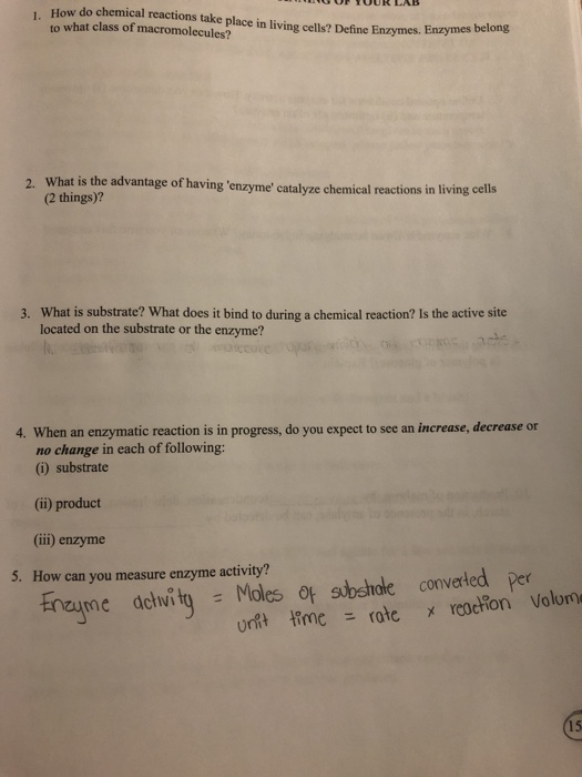 Energy, Enzymes, and Catalysis Problem Set - University of Arizona enzymes lower the activation energy for chemical reactions. C. enzymes change the Keq for chemical reactions. D. many enzymes change shape slightly when ... Enzymes affect the reactions in living cells by changing the? Oct 7, 2014 · Enzymes act as catalysts, and they almost always affect a specific reaction. Enzymes are proteinaceous biocatalysts that catalyze chemical reactions occurring in the living cell.