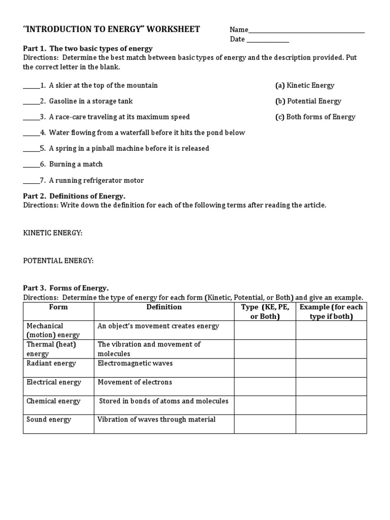 Free Worksheets On Energy Teaching Resources | TPT A perfect review tool that is a 2 pages worksheet consists of various types of questions on energy transformation. It asks students to explain energy transformations takes place in the examples in every day life. It also discusses the law of conservation of energy in energy transformations. Answer key is also included. Types of Energy (Grade 6) - Free Printable Tests and Worksheets Thermal energy a. potential energy. c. Nuclear energy b. kinetic energy. d. Kinetic energy c. static energy. d. none of the above. 7. Which form of energy does a plant store when light 8. A car or truck moving down the highway has.