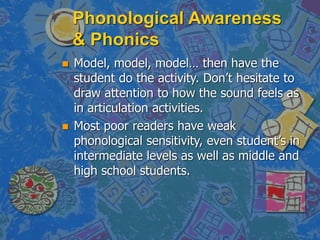 8 ways to build phonological awareness in grade-schoolers 7. Connect the skills. Look for ways to connect phonemic awareness activities to the work your child is doing in school. At home, your child's vocabulary or spelling lists can serve as helpful practice material. Ask your child to name the phonemes from the beginning, middle, and end of each word. Improving Phonological Awareness and Decoding Skills of High ... Feb 14, 2008 · Opportunities to improve phonological awareness and decoding skills will assist these students in building reading fluency, developing vocabulary knowledge, and enhancing comprehension.... Phonological Awareness Activities | Speechy Musings Phonemic awareness refers to the ability to identify and manipulate the individual sounds in words. We practice this through tasks like identifying and changing out the first sound in a word, blending sounds, and picking out the individual phonemes that make a word. These core abilities are usually absent in students with dyslexia or other ... 11 Fun Activities for Boosting Phonological Awareness 9. Silly Words (Phoneme Isolation & Identity) Give the children a sound and have them replace the sound at the beginning of their names or any other desired words. The teacher may say, "The silly sound is /b/. Change the first sound in your name to /b/," such that Mary becomes Barry and Sam becomes Bam. 10.